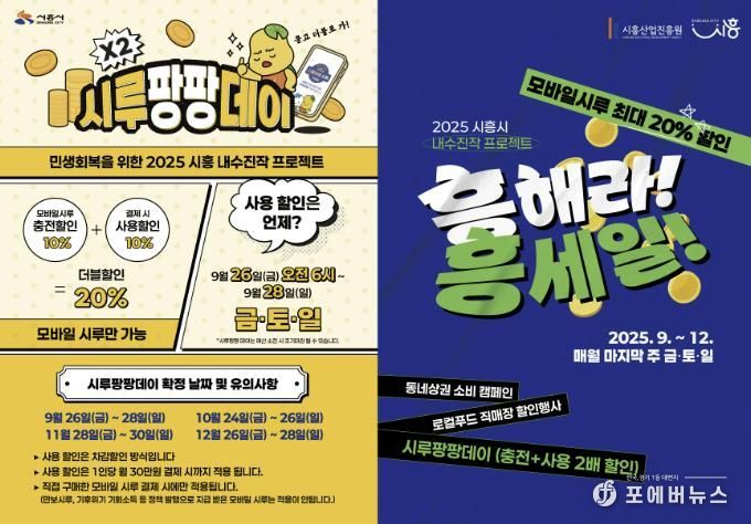 시흥시는 지난 달 말부터 지역화폐 모바일 시루를 최대 20% 할인하는 이벤트 ‘시루팡팡데이’를 추진 중이다. 사실상 시흥시의 2025년 하반기 상권 활성화 사업의 핵심인 이번 이벤트는 시흥시 지역화폐 모바일 시루를 충전 시 7~10%, 시루 가맹점에서 결제 시 추가로 7~10%할인 하는 것을 골자로 한다.