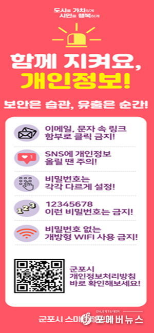 [ 포에버뉴스 김경순 기자 ] 군포시는 9월 30일 ‘개인정보 보호의 날’을 맞아 시민들의 개인정보 보호 인식을 높이고 생활 속 보호 문화를 확산하기 위해 ‘2025년 개인정보 보호의 날 기념 캠페인’을 9월 24일부터 10월 2일까지 추진한다.