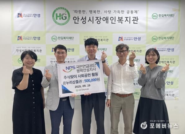 [ 포에버뉴스 김경순 기자 ] 사회복지법인 한길복지재단에서 수탁하고 있는 안성시장애인복지관은 지난 9월 29일 국민연금공단 평택안성지사로부터 사회공헌활동으로 50만원 상당의 온누리 상품권을 후원받았다고 밝혔다.
