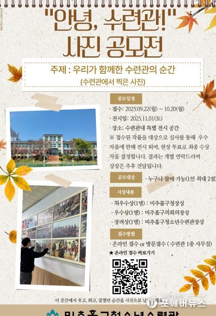 [ 포에버뉴스 김경순 기자 ] 인천 미추홀구청소년수련관은 수련관 이전을 앞두고 지난 30여 년간의 추억을 함께 기록하기 위해 ‘안녕, 수련관’ 사진 공모전을 진행하고 있다고 2일 밝혔다.