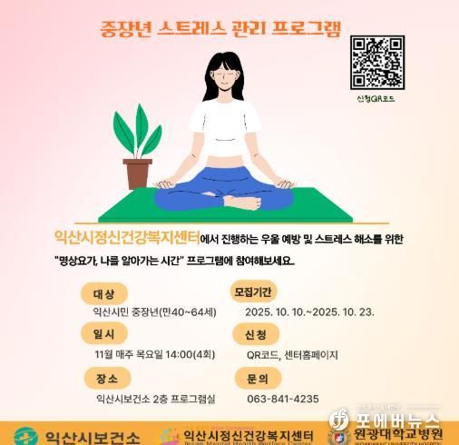 [ 포에버뉴스 이승훈 기자 ] 익산시정신건강복지센터는 만 40~64세 중장년을 대상으로 '마음힐링 명상요가' 프로그램을 운영한다고 10일 밝혔다.