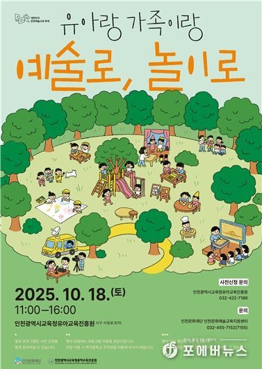 [ 포에버뉴스 김경순 기자 ] (재)인천문화재단은 인천광역시교육청유아교육진흥원과 협력하여 2025 대한민국 문 화예술교육 축제와 연계된 '유아랑 가족이랑 예술로, 놀이로' 행사를 10월 18일 오전 11시부터 오후 4시까지 인천광역시교육청유아교육진흥원에서 개최한다.