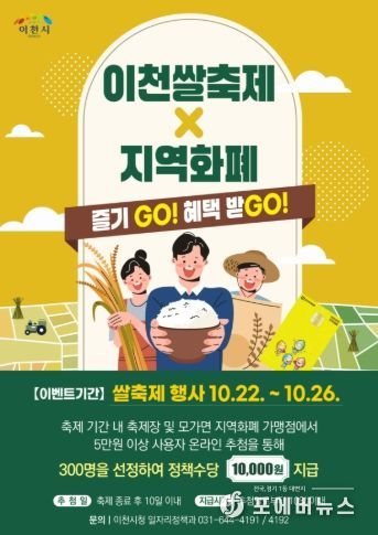 [ 포에버뉴스 박정배 기자 ] 이천시는 2025 이천쌀문화축제 기간에 지역화폐 이용을 촉진하고 지역경제를 활성화하기 위해 코나아이(주)의 경기지역화폐 사회공헌 재원을 활용하여 ‘이천쌀축제, 지역화폐로 즐기고(GO), 혜택받고(GO)’ 이벤트를 추진한다고 밝혔다.