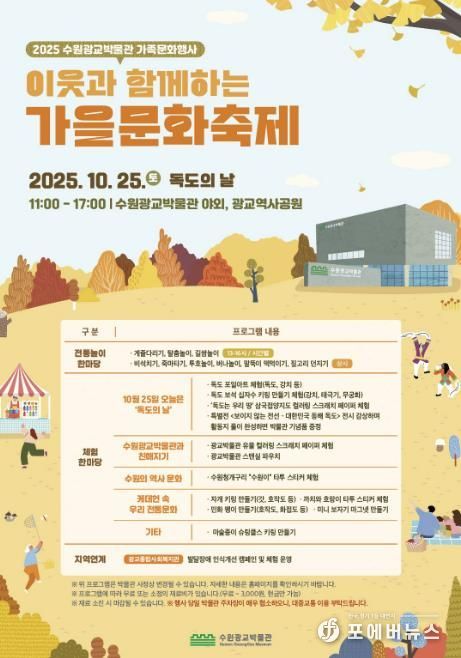 [ 포에버뉴스 김경순 기자 ] 수원광교박물관은 독도의 날인 10월 25일 오전 11시부터 오후 5시까지 수원광교박물관 야외(광교역사공원)에서 ‘2025 수원광교박물관 가족문화행사–이웃과 함께하는 가을문화축제’를 연다.