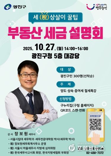[ 포에버뉴스 김경순 기자 ] 광진구는 10월 27일 오후 2시 광진구청 대강당에서 구민을 대상으로 ‘알기 쉬운 부동산 세금 설명회’를 개최한다.