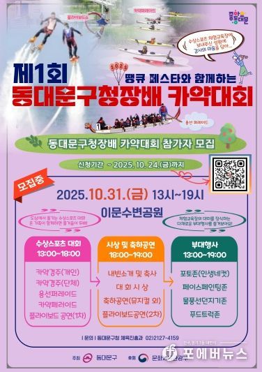[ 포에버뉴스 사공선 기자 ] 서울 동대문구는 오는 31일 오후 1시부터 7시까지 이문수변공원 내 동대문구 수상스포츠 체험교육장에서 ‘제1회 동대문구청장배 카약대회 및 2025 수상스포츠 땡큐 페스타’를 개최한다.