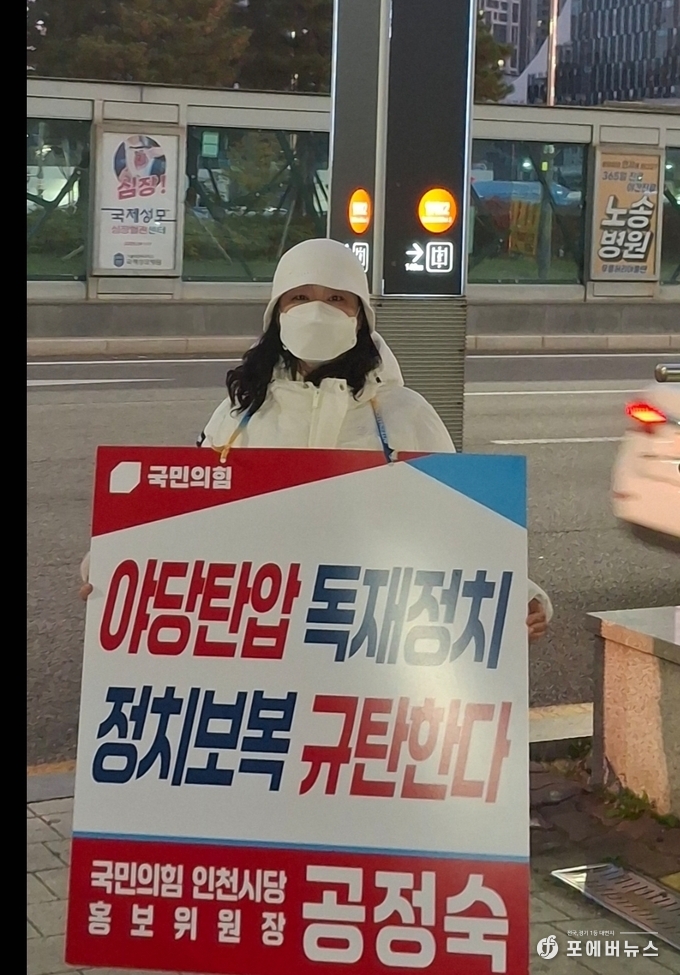 국민의힘 인천시당 공정숙 홍보위원장은 14일 현재까지 인천 가정역 3번 출구에서 총 5회에 걸쳐 ‘자유수호 1인 피켓시위’를 진행했으며, 이를 100회까지 확대해 지속할 계획이라고 밝혔다.