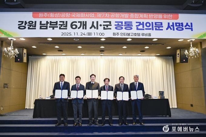 [ 포에버뉴스 사공선 기자 ] 강원 남부권 6개 시군(원주·횡성·영월·평창·정선·태백)은 24일 오전 11시, 호텔인터불고 원주에서 국토교통부의 ‘제7차 공항개발 종합계획’에 ‘원주(횡성)공항의 국제화 사업 반영’을 요청하는 공동 건의문을 채택했다.