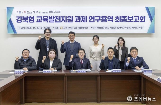 [ 포에버뉴스 김경순 기자 ] 강북구의회 의원연구단체인 ‘강북형 교육발전지원 연구회’ (대표의원 허광행)는 지난 11월 26일 의회 3층 의원회의실에서 최종보고회를 열었다.