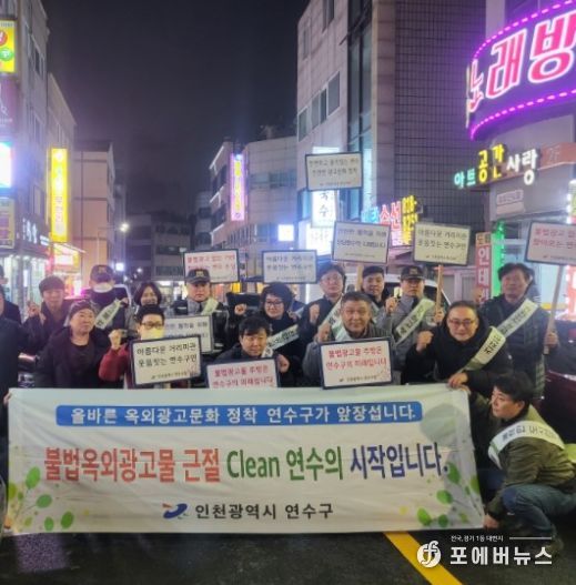 이번 단속은 구 도시계획과, 연수경찰서 범죄예방대응과, 연수1단지 상가연합회 임원진 등 총 23명이 참여해 차량 통행과 보행자의 안전을 위협하는 에어라이트, 현수막, 입간판, 전단, 벽보 등의 불법 광고물을 정비했다.