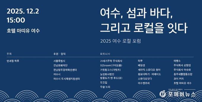 [ 포에버뉴스 오명숙 기자 ] 여수시는 ‘연과점 하루’가 오는 12월 2일 오후 3시 마띠유호텔에서 ‘여수, 섬과 바다, 그리고 로컬을 잇다 - 2025 여수 로컬 포럼’을 개최한다고 밝혔다.