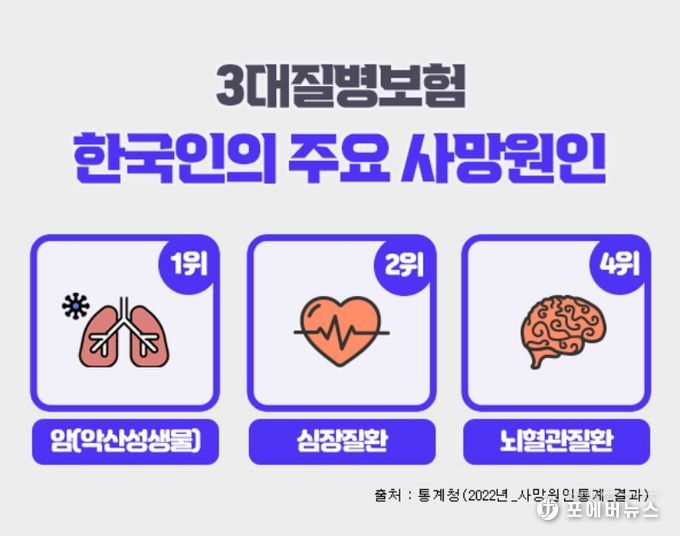 [ 포에버뉴스 김경순 기자 ] 흔히 3대질병이라 일컫는 암, 심혈관질환, 뇌혈관질환은 통계청 발표자료에 따르면 한국인의 주요 사망원인 중에서 3위 폐렴을 제외하고 1~4위를 차지하고 있으며, 이전부터 지금까지도 살면서 가장 먼저 대비해야 하는 치명적인 질병으로 강조되고 있다. 이러한 중대질병에 대비하기 위하여 상기 세가지 치명적인 질병을 집중보장하는 3대질병진단비보험을 많이 가입하고 있다. 3대진단비보험은 각각의 질병을 중점적으로 보장하면서도 가입자 특성에 맞는 특약을 추가함으로써 종합건강보험으로도 활용할 수가 있다.
