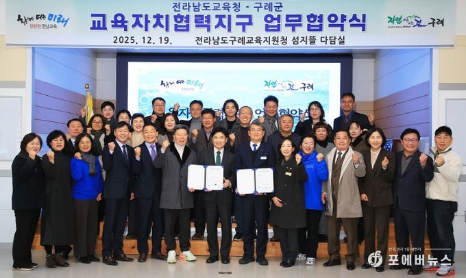 [ 포에버뉴스 오명숙 기자 ] 구례군은 지난 19일, 구례교육지원청 섬지뜰 다담실에서 전라남도교육청, 구례교육지원청, 구례군의회, 학교장, 민관산학위원, 학부모연합회 등 50여명이 참석한 가운데‘구례교육자치협력지구’업무협약을 체결했다고 밝혔다.
