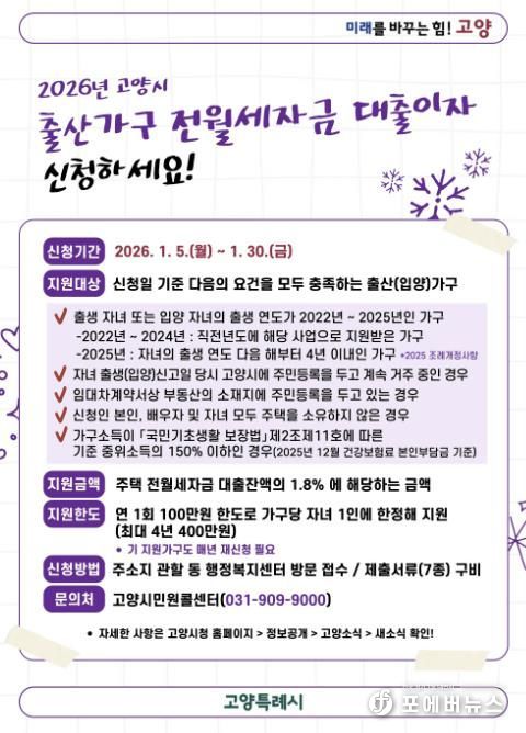 [ 포에버뉴스 사공선 기자 ] 고양특례시는 무주택 출산가구의 주거비 부담을 덜어주기 위해 ‘2026년 고양시 출산가구 전월세자금 대출이자 지원 사업’ 신청을 1월 30일까지 받는다고 밝혔다.