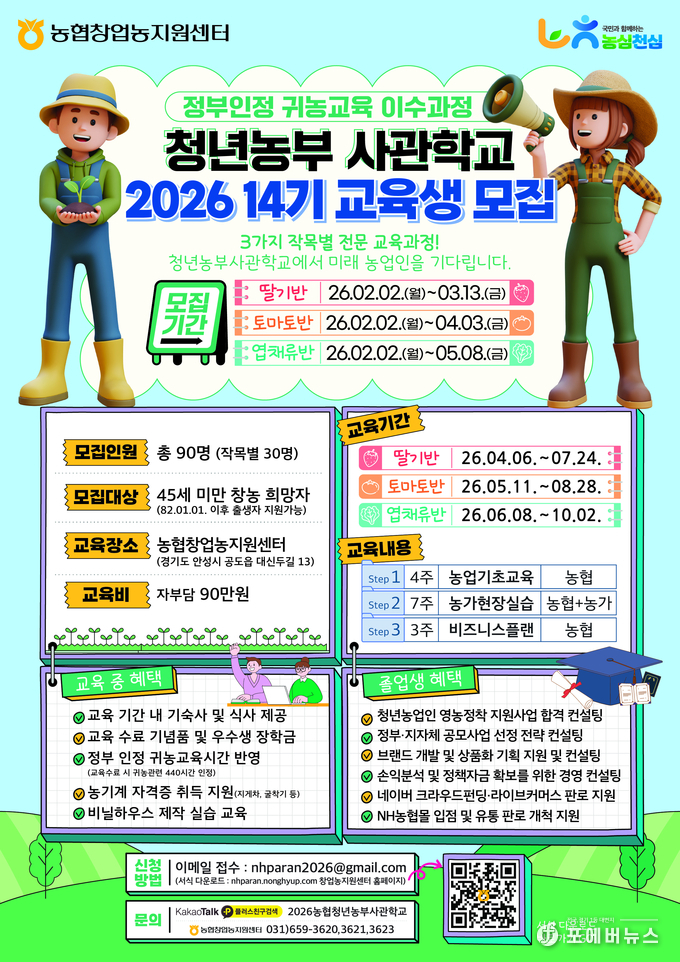 [ 포에버뉴스 김경순 기자 ] 농협중앙회는 미래 농업의 성장동력인 청년농업인 육성을 위해 2일부터 ‘2026년도 농협청년농부사관학교’ 교육생 모집을 실시한다고 밝혔다.