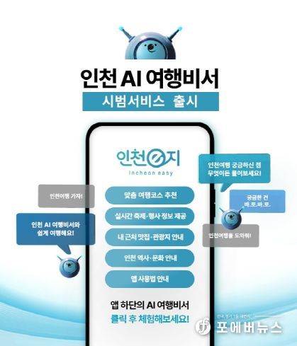 [ 포에버뉴스 김경순 기자 ] 인천광역시와 인천관광공사는 관광객이 보다 간편하게 인천 여행을 준비하고 즐길 수 있도록 스마트관광앱‘인천e지’에 생성형 인공지능(AI) 기반‘인천 AI여행비서’챗봇 서비스를 1월 29일부터 시범 운영한다고 밝혔다.