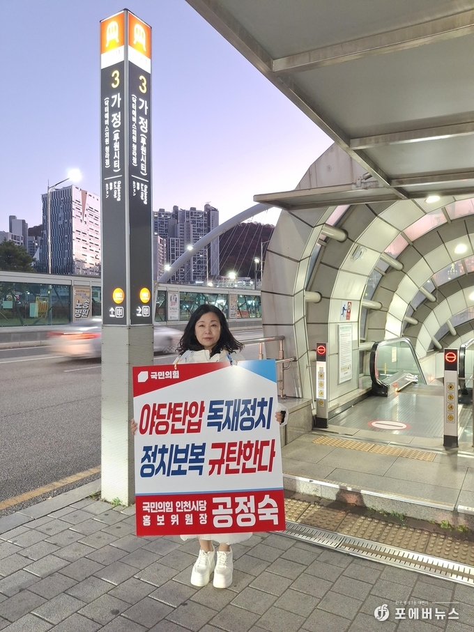 공정숙 전 의원이 민주당 국정운영을 비판하며 이어온 1인 시위를 100회로 마무리했다.