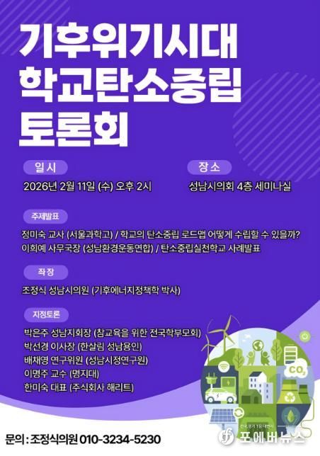 [ 포에버뉴스 김경순 기자 ] 기후위기 대응과 학교 현장의 탄소중립 실천 방안을 논의하기 위한 '기후위기 시대 학교 탄소중립 토론회'가 오는 2026년 2월 11일 오후 2시, 성남시의회 4층 세미나실에서 열린다.