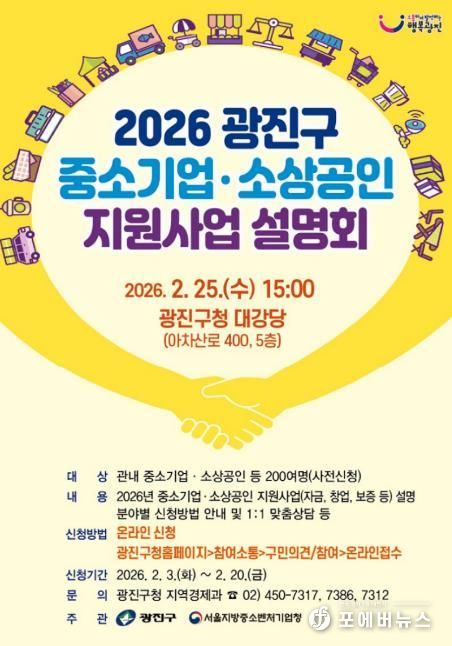 [ 포에버뉴스 김경순 기자 ] 광진구가 2월 25일 광진구청 대강당에서 서울지방중소벤처기업청과 함께 ‘2026 광진구 중소기업‧소상공인 지원사업 설명회’를 개최한다.