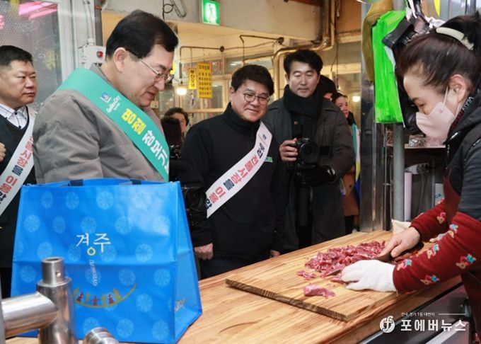 주낙영 시장이 중앙시장 내 성광식육점에서 소고기를 구매하자, 김복식 대표가 “전통시장이 살아야 우리도 산다”며 상인의 정을 보탰고, 주 시장은 이에 감사의 뜻을 전하며 상인들의 현장 목소리를 시정에 반영하겠다고 밝혔다.