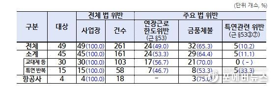 감독 결과, 4개소 전 사업장에서 총 18건의 법 위반 사항이 적발됐다. 주요 위반 내용으로는 ▴브리핑 시간 등을 제외하고 순수 비행시간만 근로시간으로 인정하는 등 야간근로수당 미지급 3개소(75.0%, 약 7억원), ▴기간제 승무원을 차별하여 비행수당 미지급 1개소(25.0%, 약 5억 5천만원), ▴산후 1년 미경과자 시간외 근로 한도 초과 2개소(50.0%) 등이 확인됐다.