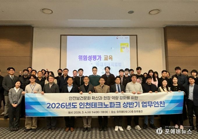 [ 포에버뉴스 김경순 기자 ] 인천테크노파크(인천TP)는 지난 4일 미추홀타워 20층 미추홀관에서 관리감독자·안전담당자 60여 명이 참석한 가운데 ‘2026년도 상반기 안전보건 업무연찬’을 개최했다.