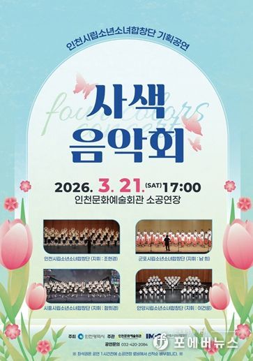 [ 포에버뉴스 김경순 기자 ] 인천시립소년소녀합창단(예술감독 조현경)이 오는 3월 21일 인천문화예술회관 소공연장에서 4개 도시의 목소리가 한데 어우러지는 특별한 교류연주 '사색음악회'를 개최한다.