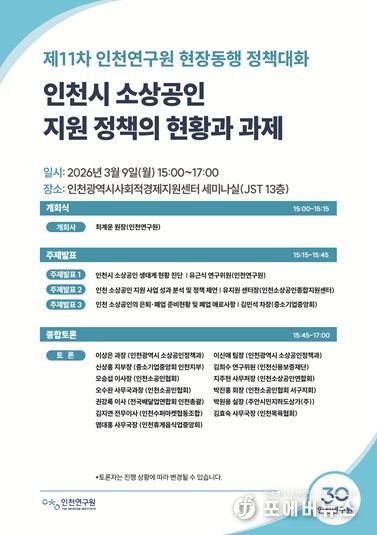 [ 포에버뉴스 김경순 기자 ] 인천연구원은 2026년 3월 9일 오후 3시 인천광역시사회적경제지원센터 세미나실에서 “인천시 소상공인 지원 정책의 현황과 과제”라는 주제로 '제11차 현장동행 정책대화'를 개최한다.
