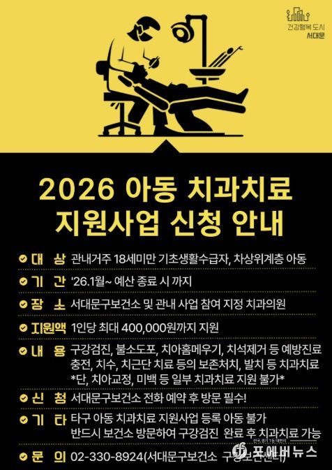 이성헌 서대문구청장은 “취약계층 아동이 평생 구강건강의 기반을 마련할 수 있도록 예방부터 치료까지 연계된 지원 체계를 강화하겠다”며 “앞으로도 아동 구강건강 격차 해소를 위한 사업에 더욱 힘쓰겠다”고 말했다.