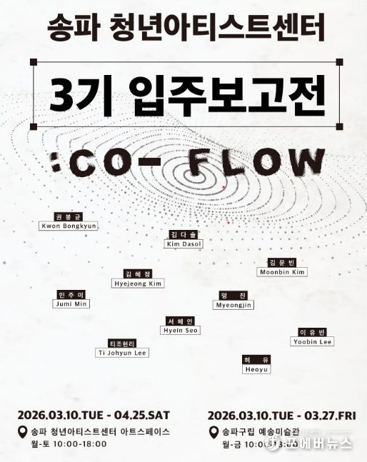 [ 포에버뉴스 김경순 기자 ] 서울 송파구는 송파청년아티스트센터 제3기 입주작가 10인의 첫 전시 ‘Co-Flow’를 3월 10일 개최했다고 밝혔다.