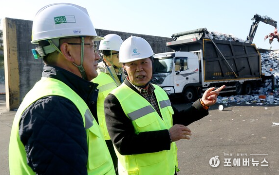 이날 오후 이영인 공사 사장을 비롯한 공사 임직원이 수원시자원순환센터 재활용품 야적장을 살피고 있다.