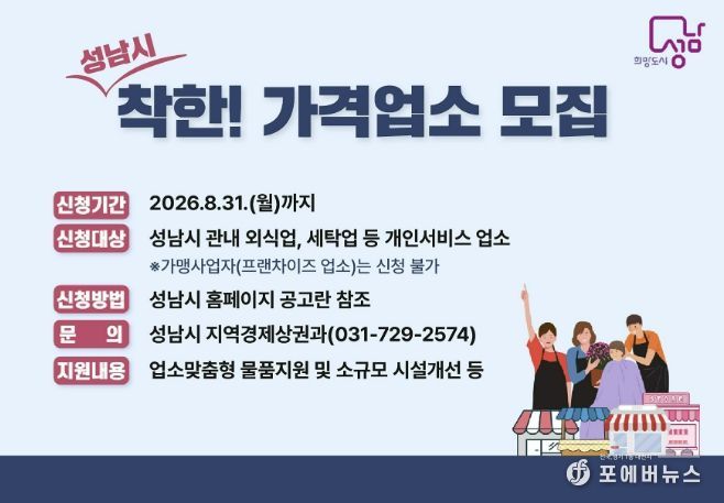 접수는 8월 31일까지 진행되며, 성남시청 홈페이지 공고문을 참고해 시청 지역경제상권과를 방문하거나 이메일 또는 우편으로 신청하면 된다.
