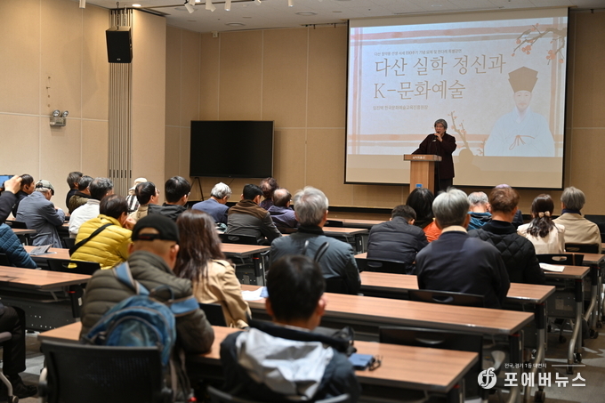 특히 올해는 묘제 20주년을 기념하여 실학박물관 열수홀에서 ‘다산 정약용의 실학정신과 K-문화예술’을 주제로 한 임진택 진흥원장의 특별강연이 진행되었다. 임진택 진흥원장은 실사구시와 경세치용 정신을 바탕으로 교육의 의미를 개인의 학문 성취에서 실천과 공동체 기여로 확장한 정약용 선생 교육사상의 중요성을 역설했다. 특히 모든 인간을 존중하는 민본 중심의 교육관은 ‘누구나 참여할 수 있는 보편적 문화예술 교육’의 가치와 연결되며, 도덕성과 자기성찰에 기반한 실천이 오늘날 대한민국의 문화예술 교육이 나아갈 방향임을 시사하며 청중의 큰 호응을 얻었다. 강연 종료 후에는 실학박물관 다산정원에서 참여자들이 함께 제수 음식과 차를 나누어 먹는 음복을 진행하며 행사를 마무리했다.