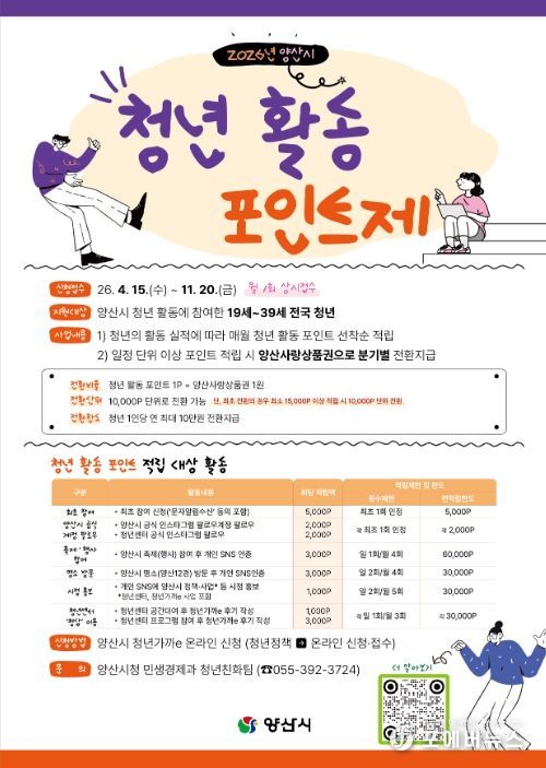 [ 포에버뉴스 사공선 기자 ] 양산시는 청년들의 능동적인 사회활동 참여를 이끌어내고 지역사회에 대한 관심을 높이기 위해 ‘2026년 양산시 청년 활동 포인트제’를 신규 시행한다고 밝혔다.