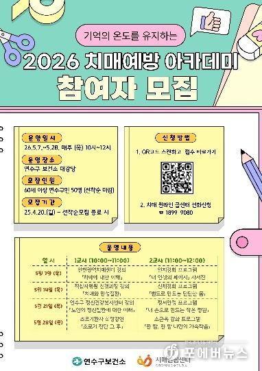 [ 포에버뉴스 김경순 기자 ] 연수구는 다음 달 7일부터 28일까지 치매 발병 지연과 예방을 위한 ‘2026 치매예방 아카데미’를 운영한다.