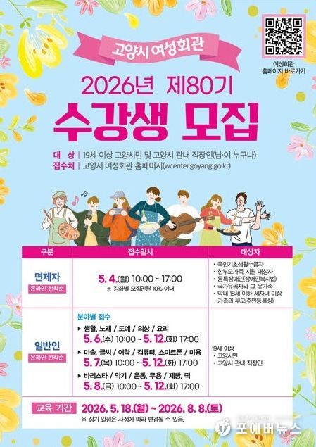 [ 포에버뉴스 김경순 기자 ] 고양특례시 여성회관은 오는 5월 4일부터 12일까지 2026년 제80기 정규강좌 수강생을 모집한다.