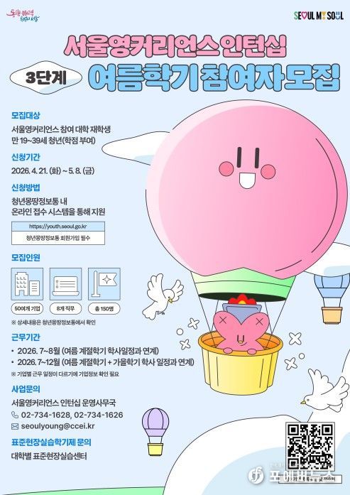 [ 포에버뉴스 김경순 기자 ] 서울시가 국내 최초로 도입한 초기 청년 대상 단계별 취업 지원책인 ‘서울영커리언스 사업’의 3단계, 인턴십의 여름학기 참여자 150명을 모집한다고 밝혔다.