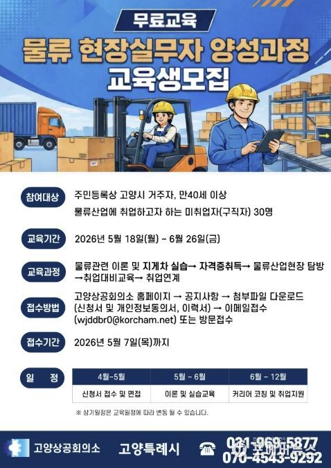 [ 포에버뉴스 김경순 기자 ] 고양특례시는 2026년 고양맞춤형 일자리학교 공모에 선정된 ‘물류 현장실무자 양성과정’에 참여할 교육생을 오는 5월 7일까지 모집한다.