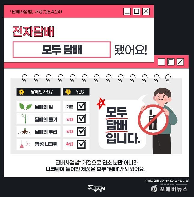 [ 포에버뉴스 김경순 기자 ] 서울 강서구는 오는 24일부터 시행되는 담배사업법 개정에 따라 전자담배를 포함한 모든 담배 제품에 대한 단속을 강화한다고 밝혔다.