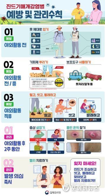 보건소 관계자는 “야외활동 시 진드기에게 물리지 않도록 예방수칙을 철저히 준수해야 한다”라며, “진드기에 물린 후 2주 이내에 38도 이상의 발열이나 소화기 증상이 나타나면 즉시 의료기관을 방문해 진료를 받아야 한다”라고 강조했다.