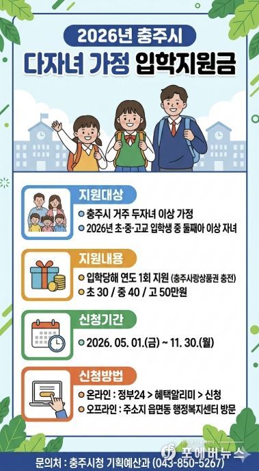 [ 포에버뉴스 사공선 기자 ] 충주시는 다자녀 가정의 경제적 부담을 완화하고 안정적인 양육 환경을 조성하기 위해 2026학년도 초·중·고등학교에 입학하는 둘째 자녀 이상에게 입학지원금을 지원한다고 밝혔다.