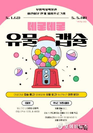 [ 포에버뉴스 김경순 기자 ] 부평역사박물관은 어린이날을 맞아 5월 1일~5일(4일 휴관)까지 어린이와 가족 단위 관람객을 위한 체험 프로그램 ‘데굴데굴 유물 캡슐’을 운영한다.