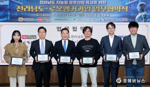 전남도는 29일 도청 서재필실에서 레인보우로보틱스, 두산로보틱스, 뉴로메카, 클로봇, 시즐 등 국내 로봇 앵커기업 5개사와 ‘지능형 로봇산업 육성을 위한 업무협약’을 했다.