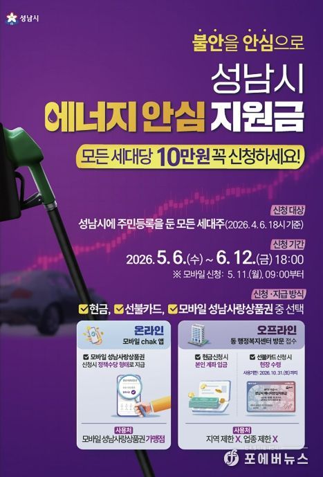 [ 포에버뉴스 사공선 기자 ] 성남시는 중동 사태에 따른 국가 자원안보 위기 경보 발령으로 경제적 부담이 커진 시민들을 지원하기 위해 전국 최초로 ‘성남시 에너지 안심지원금’을 오는 5월 6일부터 신청을 받는다고 밝혔다.