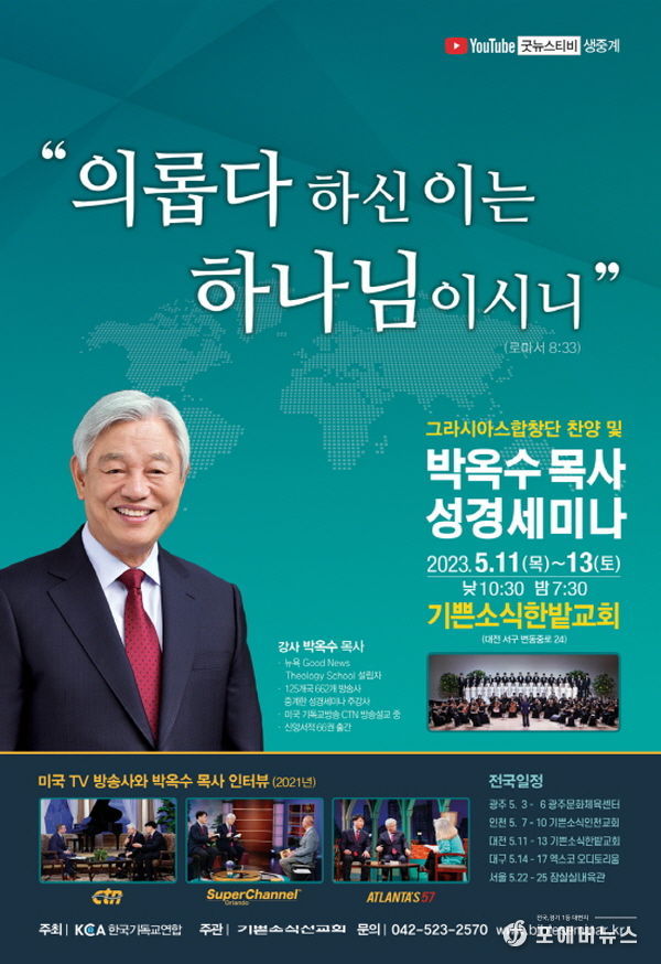 [ 포에버뉴스 김경순 기자 ] ‘죄사함의 복음’으로 전 세계 기독교를 선도하는 ‘박옥수 목사 성경세미나’가 대전·충청지역 시민들을 대상으로 5월 11일(목)부터 13일(토)까지 기쁜소식 한밭교회에서 개최된다.