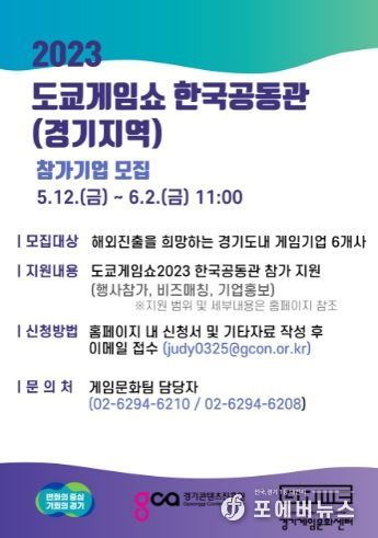 [ 포에버뉴스 김경순 기자 ] 경기도는 ‘2023년 도쿄게임쇼’ 한국공동관 참여기업을 오는 6월 2일까지 모집한다.