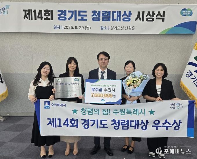 [ 포에버뉴스 김경순 기자 ] 수원특례시가 제14회 경기도 청렴대상에서 우수상으로 선정됐다. 시상식은 29일 경기도청 단원홀에서 열렸다.