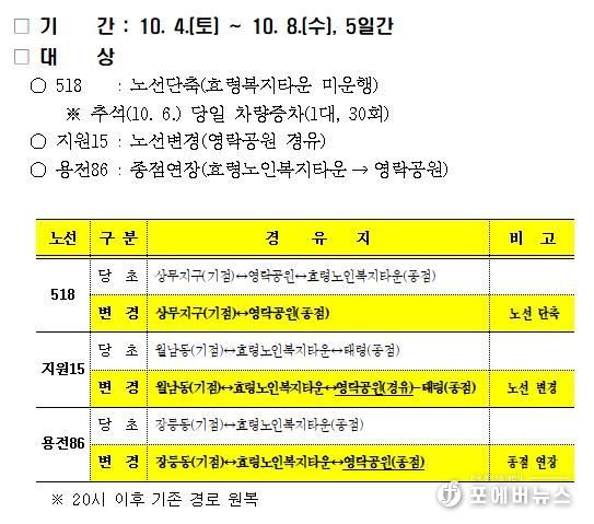 상무지구~종합버스터미널~영락공원을 운행하는 518번 시내버스는 추석 당일(6일) 30회 증차 운행하고, 월남동~태령을 운행하는 지원15번은 영락공원을 경유해 운행한다.