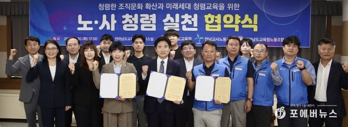 [ 포에버뉴스 오명숙 기자 ] 전라남도교육청은 30일 청사 비즈니스실에서 전남교사노동조합, 전라남도교육청노동조합과 ‘청렴 실천 협약(MOU)’을 맺고 청렴한 조직문화 확산과 미래세대 청렴교육 강화를 약속했다.