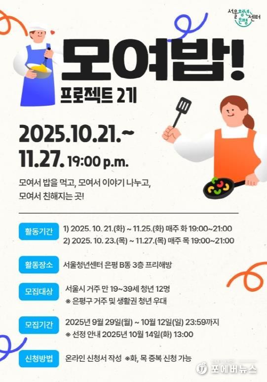 [ 포에버뉴스 김경순 기자 ] 서울 은평구는 서울청년센터 은평이 요리와 봉사를 결합한 청년 커뮤니티 프로그램 ‘모여밥’의 2기 참여 청년을 오는 12일까지 모집한다고 밝혔다.